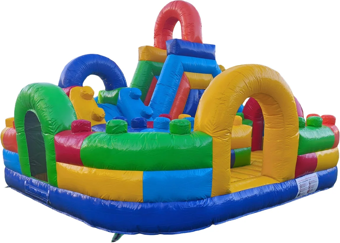 Castillo hinchable infantil de 6x6x6 metros con zona de salto, obstáculos interiores y tobogán integrado. Su diseño tipo bloques de construcción lo convierte en una atracción muy visual y perfecta para cumpleaños, comuniones y eventos infantiles en Málaga y la Costa del Sol.