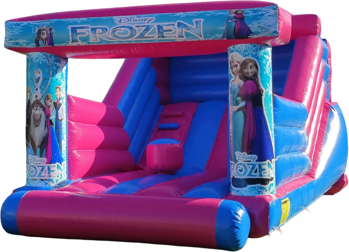 Su diseño con colores vivos y ambientación inspirada en princesas de hielo lo convierte en el protagonista perfecto para fiestas de cumpleaños, comuniones y eventos familiares. El tobogán frontal y el obstáculo interior permiten una dinámica de juego continua, combinando salto, escalada y deslizamiento en un solo hinchable.
