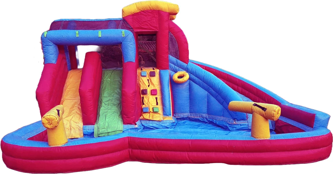 Un multijuego acuático de gran formato que combina zona de salto, deslizamiento y piscina frontal, ofreciendo máxima diversión y gran impacto visual en jardines amplios, colegios y eventos privados.